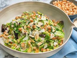 Blanda ihop dressingen med salladen. Lägg på bacon och kyckling. Toppa med krutonger och hyvlad parmesan.