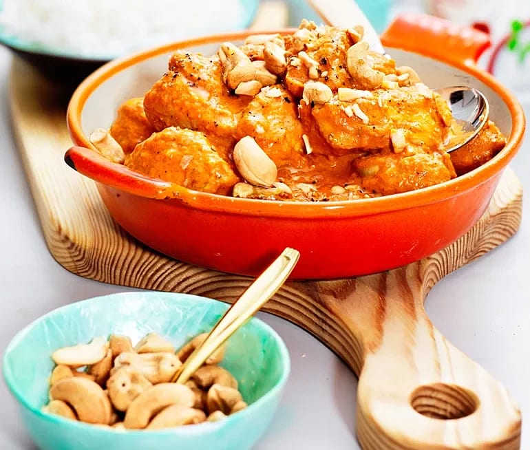 - Plocka upp kycklingen ur grytan och lägg åt sidan. Mixa såsen jämn med stavmixer eller i matberedare. Rör ner yoghurt och grädde. Lägg tillbaka kycklingen i såsen och koka ytterligare ca 2 minuter.