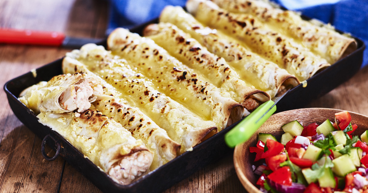 Lägg kycklingröran i mitten på varje bröd. Rulla ihop och lägg därefter i formen.