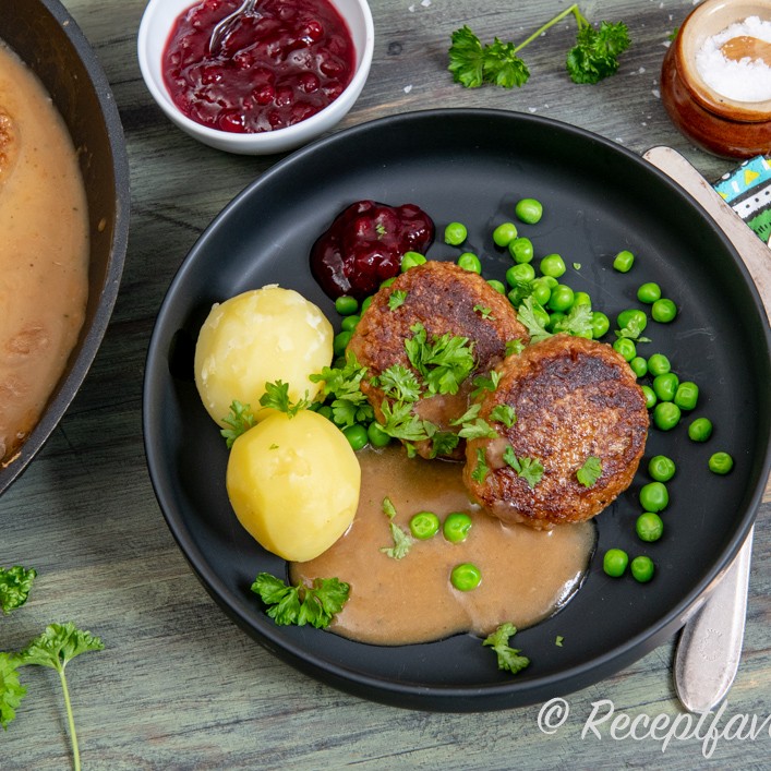 - Forma färssmeten till 8 biffar och stek gyllenbruna i en stekpanna. Stek i omgångar och lyft över i en ugnsform. Laga färdigt biffarna i ugnen i 10-15 minuter.
