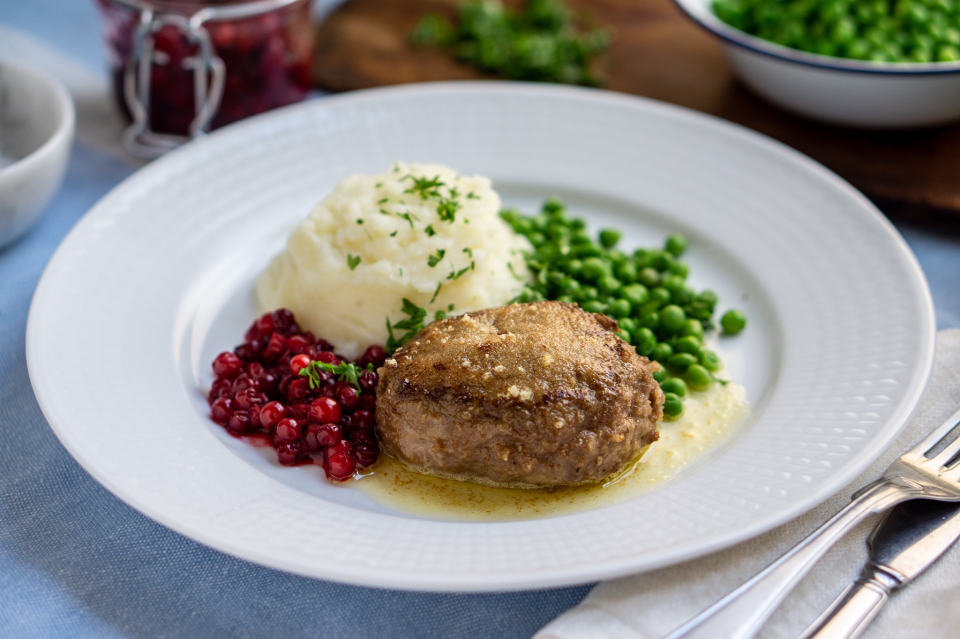 Lägg wallenbergarna på en plåt. Sätt in plåten mitt i ugnen i ca 15 minuter eller till en innertemperatur på 70 grader. - Ärter: Koka upp vatten, smör, lök och salt i en kastrull. Lägg ner ärtorna och sjud 2–3 minuter.