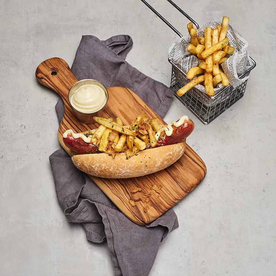 - Lägg korvarna i bröden ringla lite majonnäs på korven och toppa med pommes frites och ringla eventuellt mer majonnäs ovanpå.