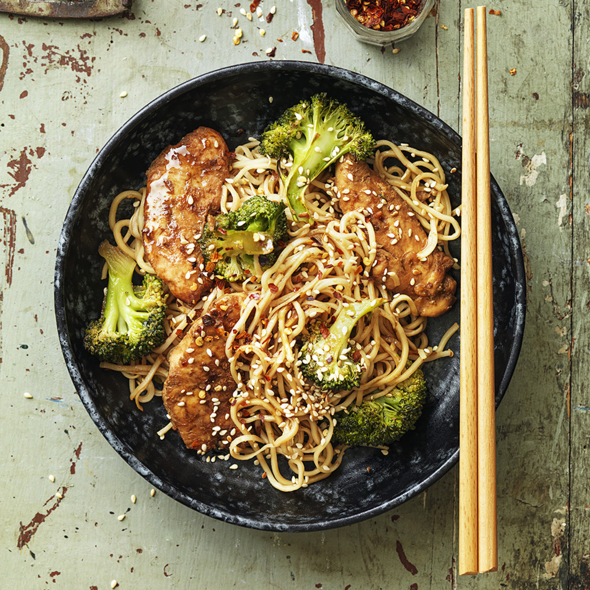 Blanda ner kycklingen, woksåsen och det kokta nudlarna i pannan. Fräs i någon minut.