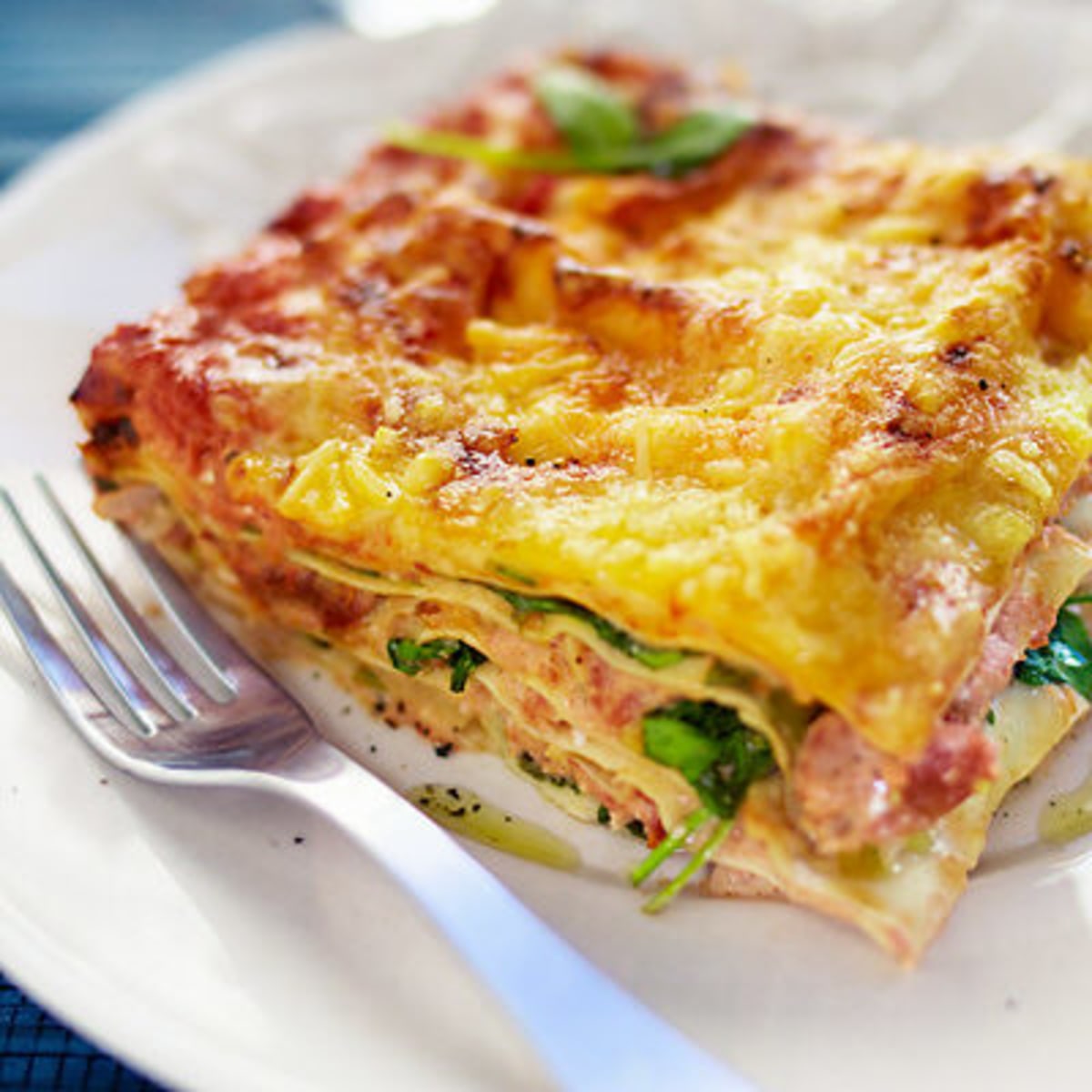 - Lägg ut hälften av spenatröran i en oljad ugnssäker form, ca 20 x 30 cm (för 4 port). Varva sedan lasagneplattor och laxröra och avsluta med resten av spenatröran.