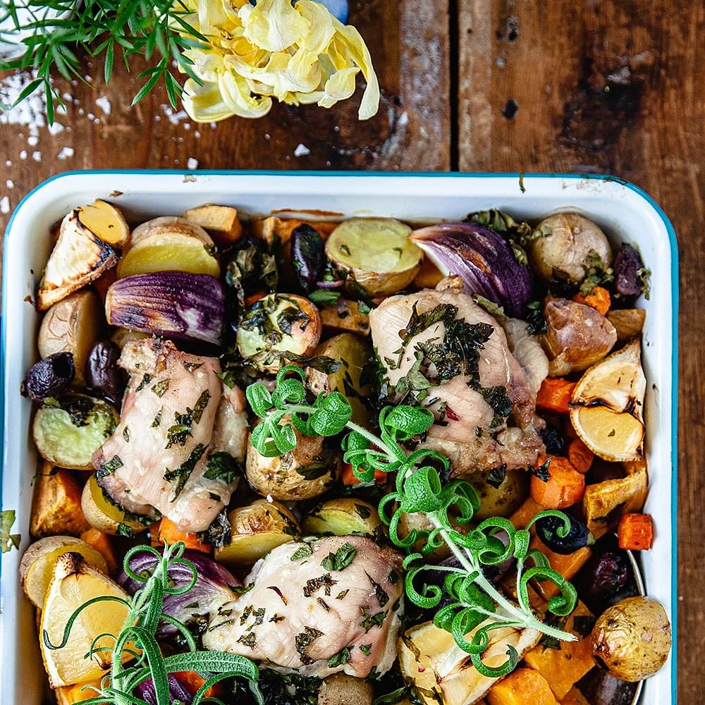 - Skär löken i klyftor. Skär morötter i tunna stavar och dela broccolin i buketter. Lägg allt på plåten bredvid kycklingen.