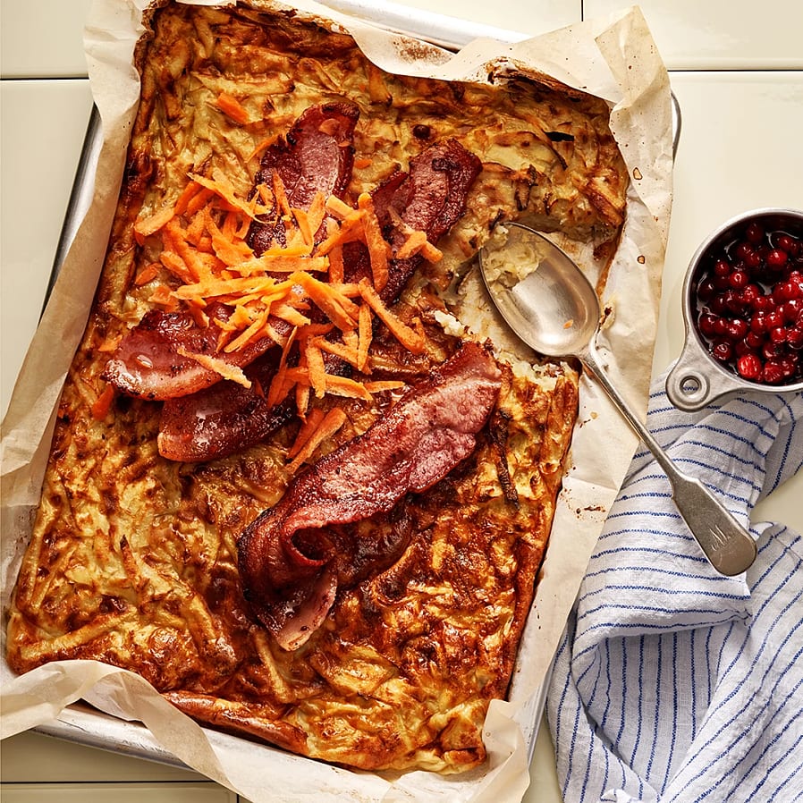 - Skala och riv potatisen grovt. Blanda ner i smeten. Häll smeten i långpannan. Grädda i mitten av ugnen 30–35 minuter eller tills den är krispig och gyllene.